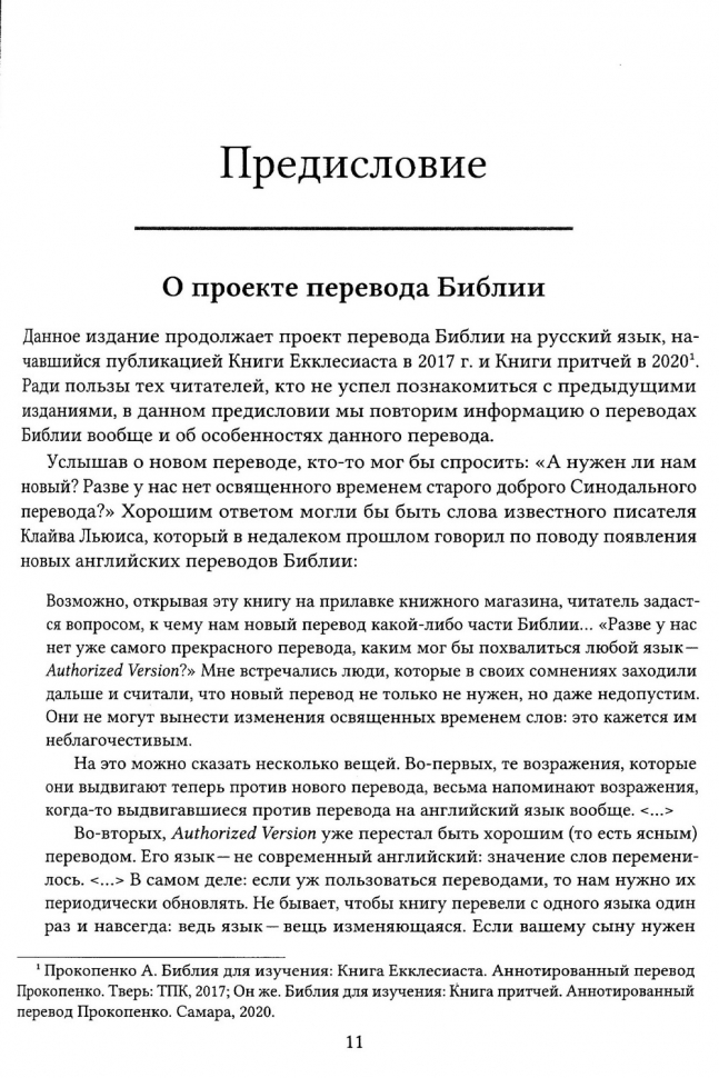 "Возможно, открывая эту книгу на прилавке книжного магазина, читатель задастся вопросом, к чему нам новый перевод какой-либо части Библии… «Разве у нас нет уже самого прекрасного перевода, каким мог бы похвалиться любой язык – Authorized Version?» Мне встречались люди, которые в своих сомнениях заходили дальше и считали, что новый перевод не только не нужен, но даже недопустим. Они не могут вынести изменения освященных временем слов: это кажется им неблагочестивым.