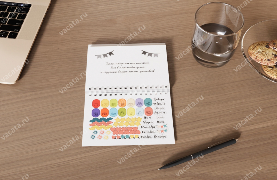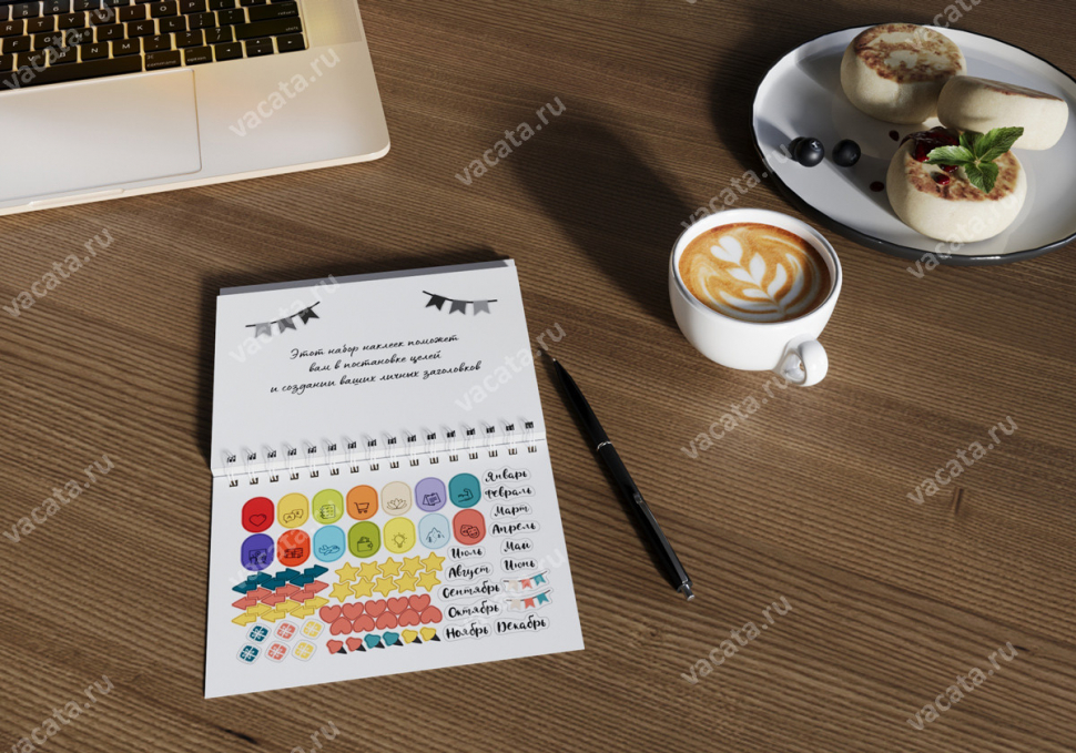 Кроме того, благодаря специальному листу с наклейками вы можете создать свой собственный индивидуальный ежедневник. Наклейки-стикеры помогут вам в постановке целей и создании личных заголовков.