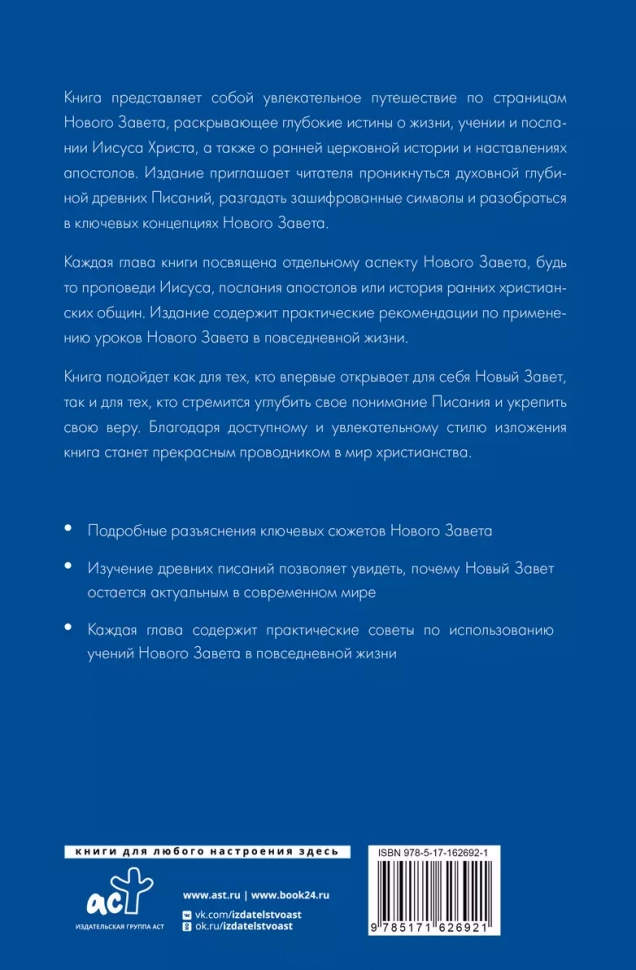 ID#17814Книга представляет собой увлекательное путешествие по страницам Нового Завета, раскрывающее глубокие истины о жизни, учении и послании Иисуса Христа, а также о ранней церковной истории и наставлениях апостолов. Издание приглашает читателя проникнуться духовной глубиной древних Писаний, разгадать зашифрованные символы и разобраться в ключевых концепциях Нового Завета. Каждая глава книги посвящена отдельному аспекту Нового Завета, будь то проповеди Иисуса, послания апостолов или история ранних христианских общин. Издание содержит практические рекомендации по применению уроков Нового Завета в повседневной жизни. Книга подойдет как для тех, кто впервые открывает для себя Новый Завет, так и для тех, кто стремится углубить свое понимание Писания и укрепить свою веру. Благодаря доступному и увлекательному стилю изложения книга станет прекрасным проводником в мир христианства.